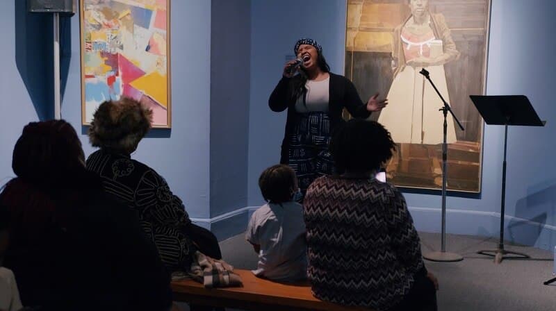 Singer Ashley Villard performing inside the NCAAA gallery space as part of All Black Everything on February 26, 2023. Photo by Bluebird Productions. Photo courtesy of City of Boston Equity and Inclusion Cabinet.