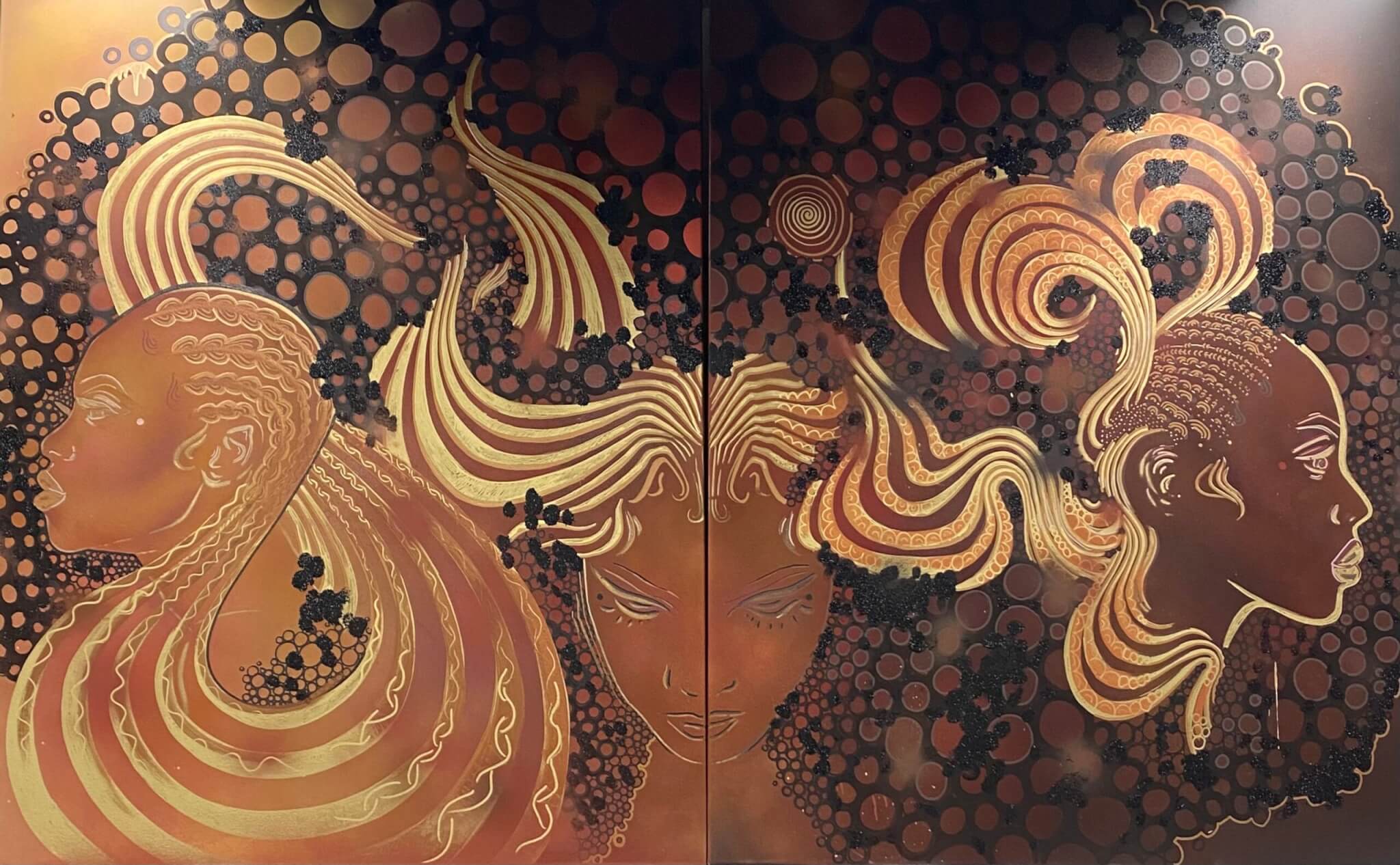 Attendees also watched Afro-Dominican artist Sagie Vangelina create a live painting on a canvas and living archive full of words like “My Black is beautiful” and “Live in my truth.” The canvas came from the cabinet’s Sankofa Night at Black Market on February 9, during which participants wrote intentions for the Black diaspora—“what they hoped, what they wished and dreamed for Black people,” said McCollin—on a board while experiencing dance, poetry, live music, and a Black vendors market, as well as having a conversation about the legacy of anti-Blackness. Vangelina’s painting responded to the prompt of painting Black resistance, based on the national Black History Month theme. As Vangelina painted three majestic Black woman figures in her abstract expressionist style, the words on the canvas gradually blended into the DNA of the artwork, radiating below layers and layers of work. A community of voices thus resonates at the painting’s foundation. The three Black women, varying in skin tone and hair texture, wear cornrows that expand and interconnect in a flowing network—like dream highways, or portals. They are the pillars of a world of its own. Any Black woman can see themselves in it: As McCollin said, “It feels like it’s me.” Vangelina continued to work in her studio, and now the final product, titled I AM, will hang in City Hall for all to see.