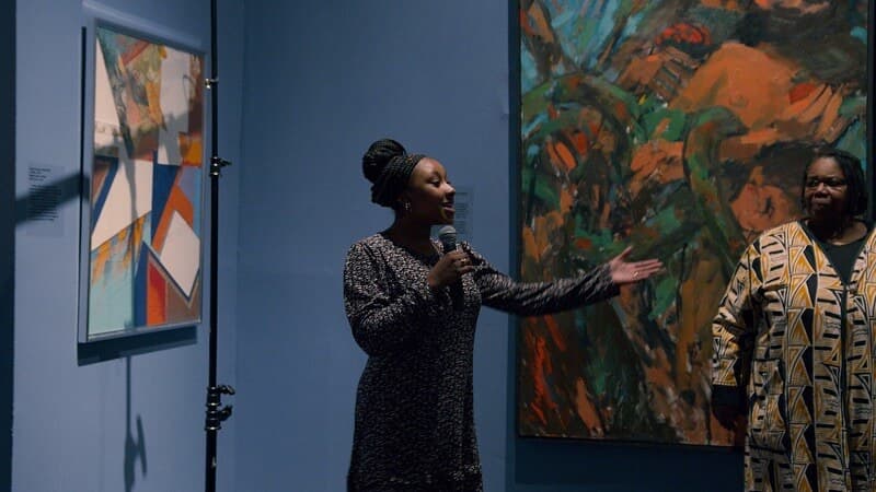 Then soul soundscapes curated by the DJ traveled throughout as everyone roamed—and sometimes danced around—the NCAAA gallery spaces, both chatting and silently observing. The DJ was none other than Chris Grant, cofounder of Black Market in Nubian Square. As afternoon turned to evening, Edmund Barry Gaither, founding director of the NCAAA, gave enthusiastic tours of the permanent exhibition “ASPELTA: A Nubian King’s Burial Chamber.” Visitors also explored the artworks on view, many of them by local Black artists and portraying Black subjects. From an endearing and curious photograph of a Black boy just above the surface of shadows (Rudolph Robinson’s Ome), to a politically charged pastel mural study of Black woman maternity, later painted in the South End as a part of Boston’s Black art and mural movement (Sharon Haggins Dunn’s Mural Study), to paintings of Black women artists in Boston and NCAAA’s renowned founder herself—Dr. Elma Lewis—to jazzy mixed-media collage, lithographs, and abstraction, the possibility of Black art space vibrated throughout the rooms.