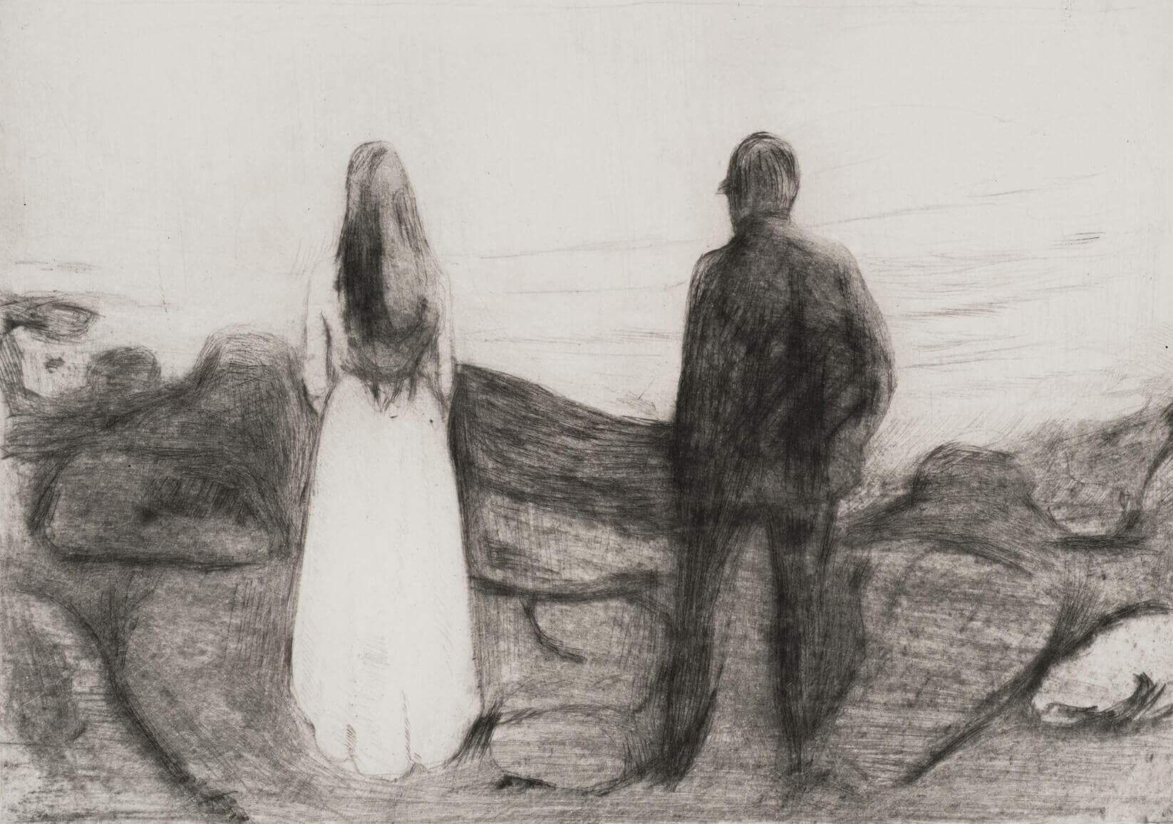 Edvard Munch, Two Human Beings (The Lonely Ones), 1894. Etching and drypoint printed in black ink on white wove paper. Harvard Art Museums/Fogg Museum, The Philip and Lynn Straus Collection, 2023.559. Photo: © President and Fellows of Harvard College. Courtesy of the Harvard Art Museums.