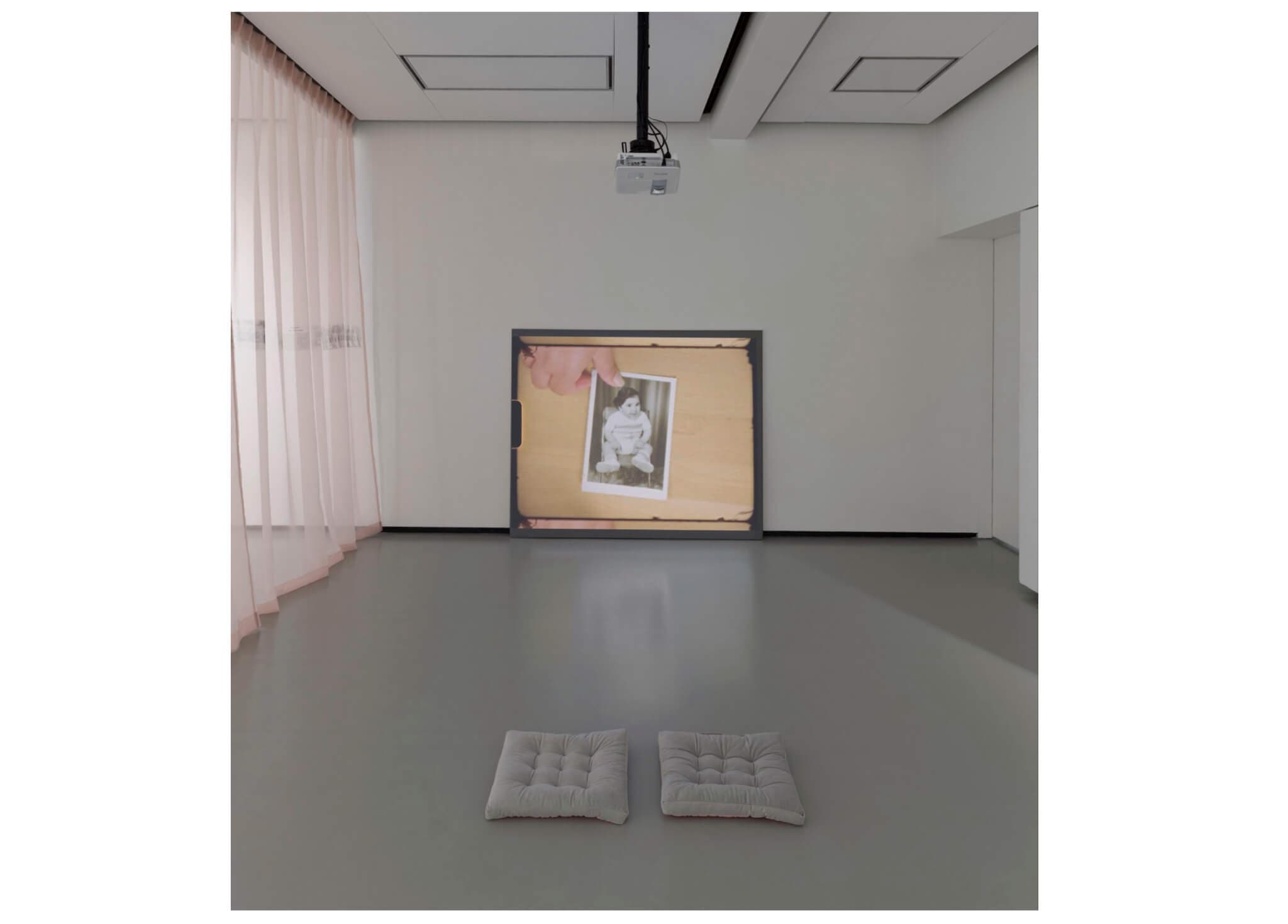 A single-channel video, a translucent screen, and works printed on mirrors in a gallery.