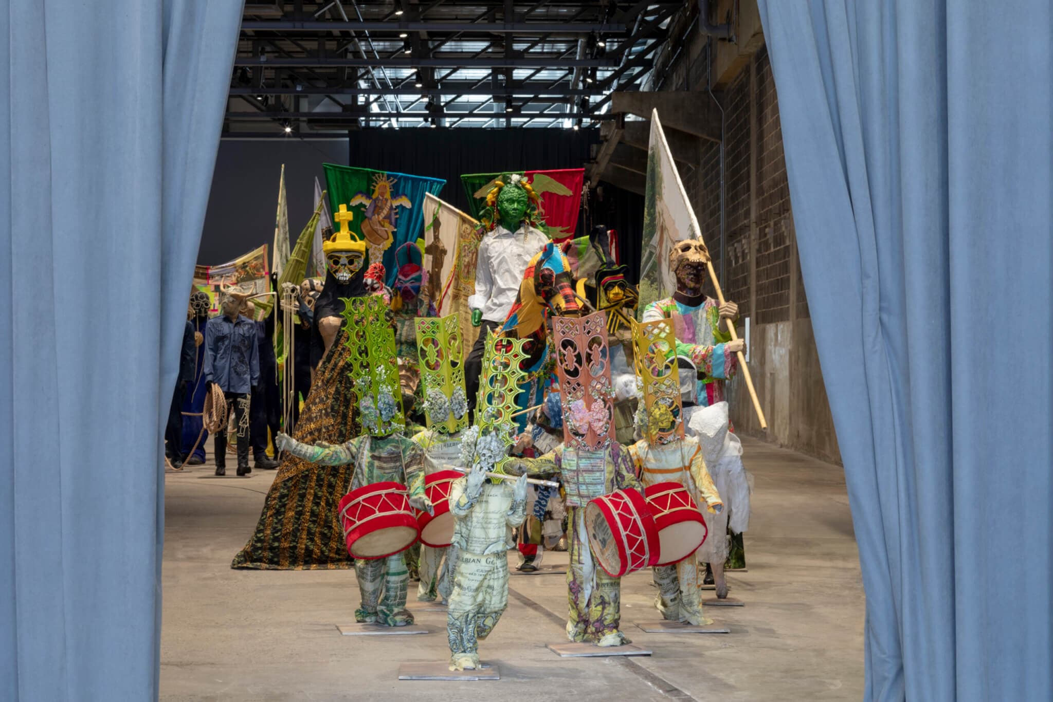 Installation view, “Hew Locke: The Procession,” the Institute of Contemporary Art/Boston, 2024. Photo by Mel Taing.