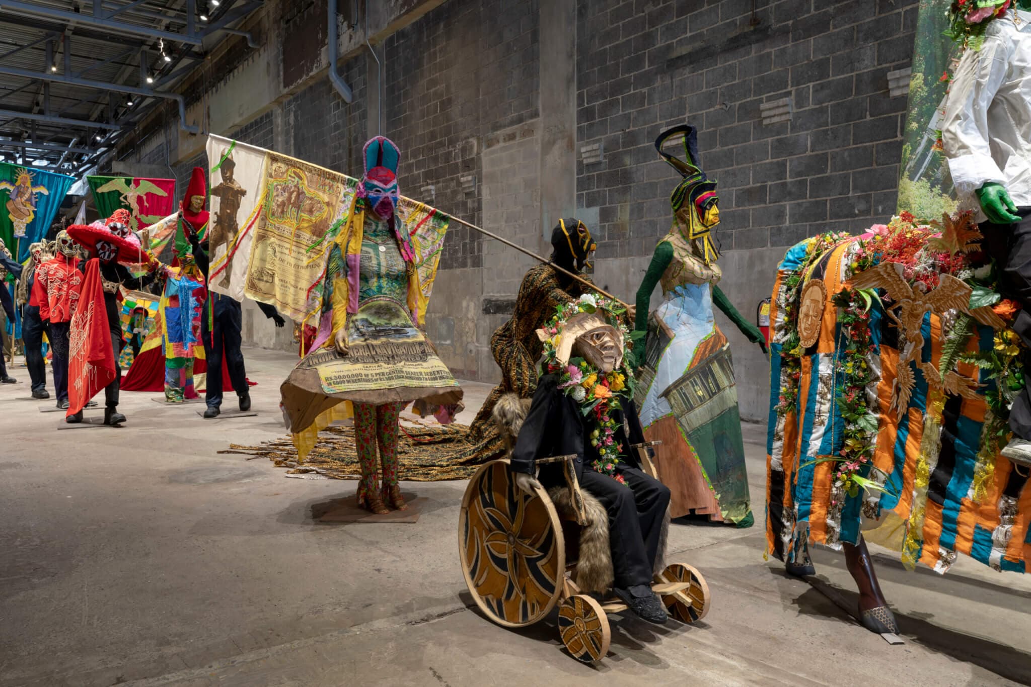 Installation view, “Hew Locke: The Procession,” the Institute of Contemporary Art / Boston, 2024. Photo by Mel Taing.
