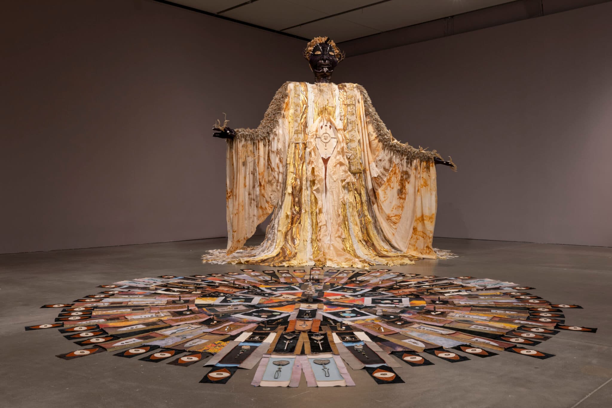 (floor) The Last Transmission, 2024, (figure) The Handle of the Axe, 2024. Installation view, “Tau Lewis: Spirit Level,” the Institute of Contemporary Art/Boston, 2024. Photo by Mel Taing.