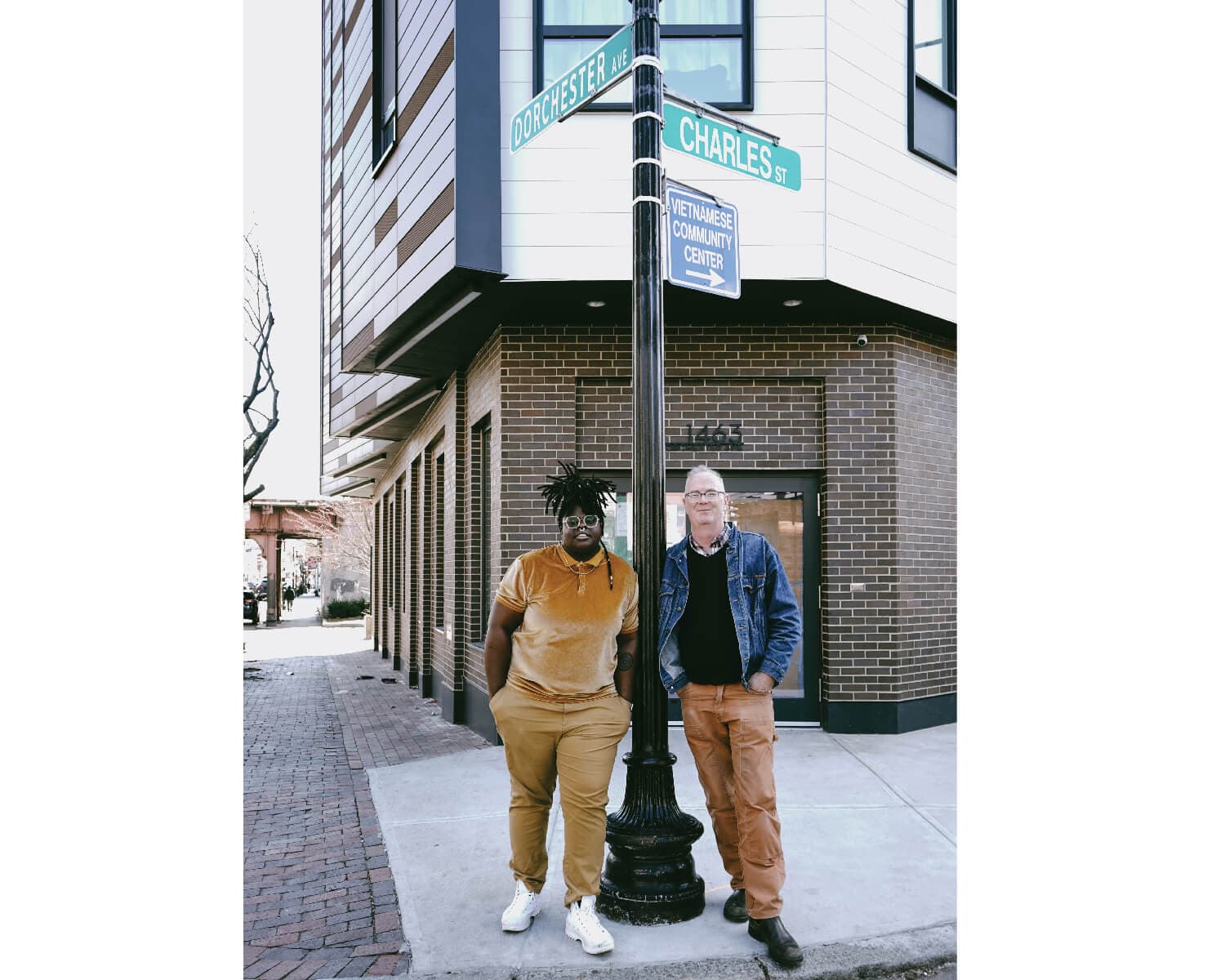I arrived at a side road intersecting the bustling Dorchester Ave and saw family homes, a high school, and a hair salon. Nestled at the corner of the street leading into the main road was 1463 Dorchester Ave, the new home of justBook-ish: an upcoming independent bookstore located in the historic Fields Corner business district on the ground floor of a recently completed affordable housing complex. When I entered the site with co-owners Porsha Olayiwola and Bing Broderick in March, contractors from the Black-owned construction company Erise Builders were still laying the foundation. “This is the bar, this is the stage, and these are the bookshelves,” mused Olayiwola, gesturing toward different areas in the space that were at the time just blocks of wood and tape. Olayiwola and Broderick are both Fields Corner residents who have felt the lack of a bookstore in their neighborhood. Now, with justBook-ish slated to open in August, they are reimagining what a Bostonian bookstore looks like, where it lives, and who it serves.