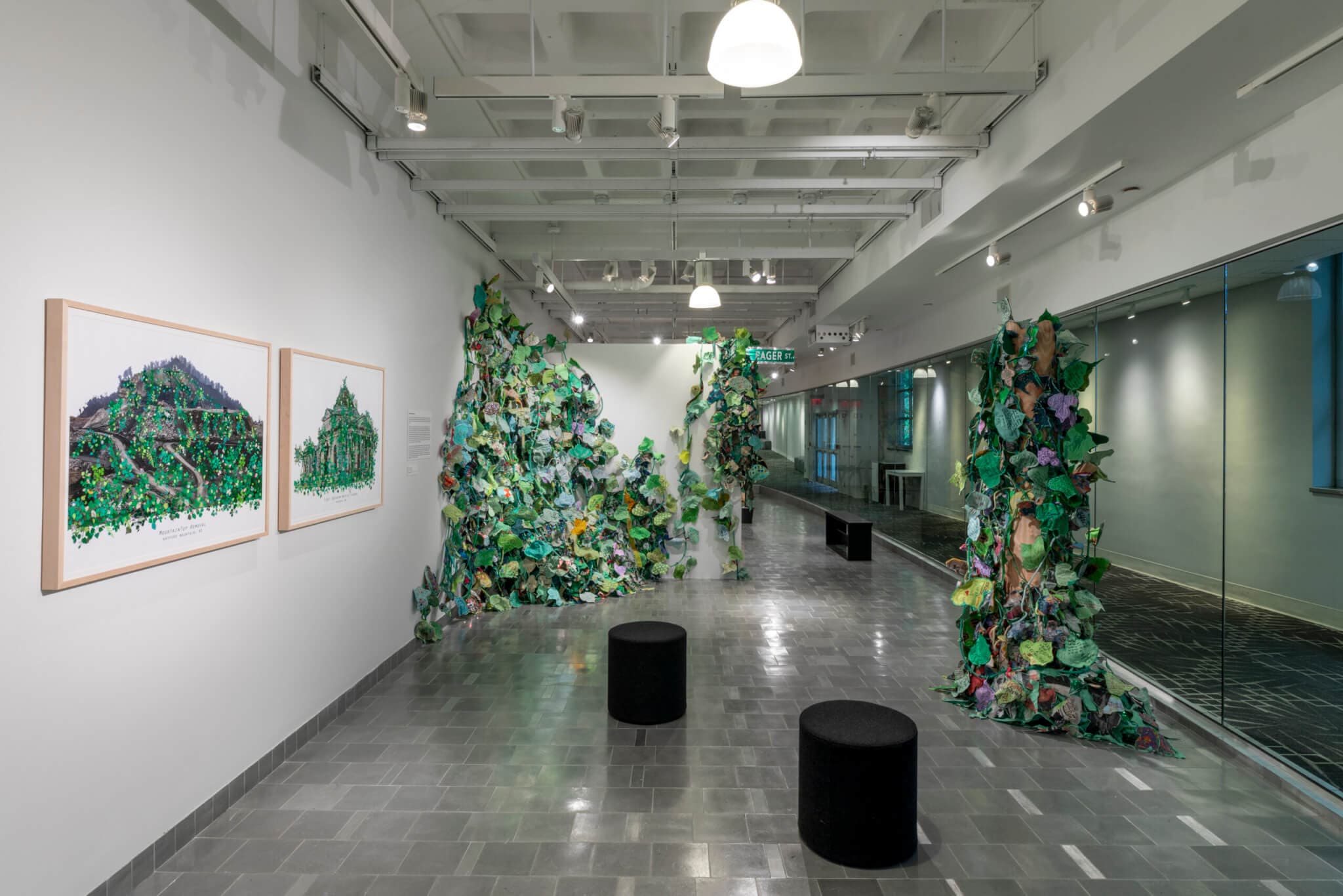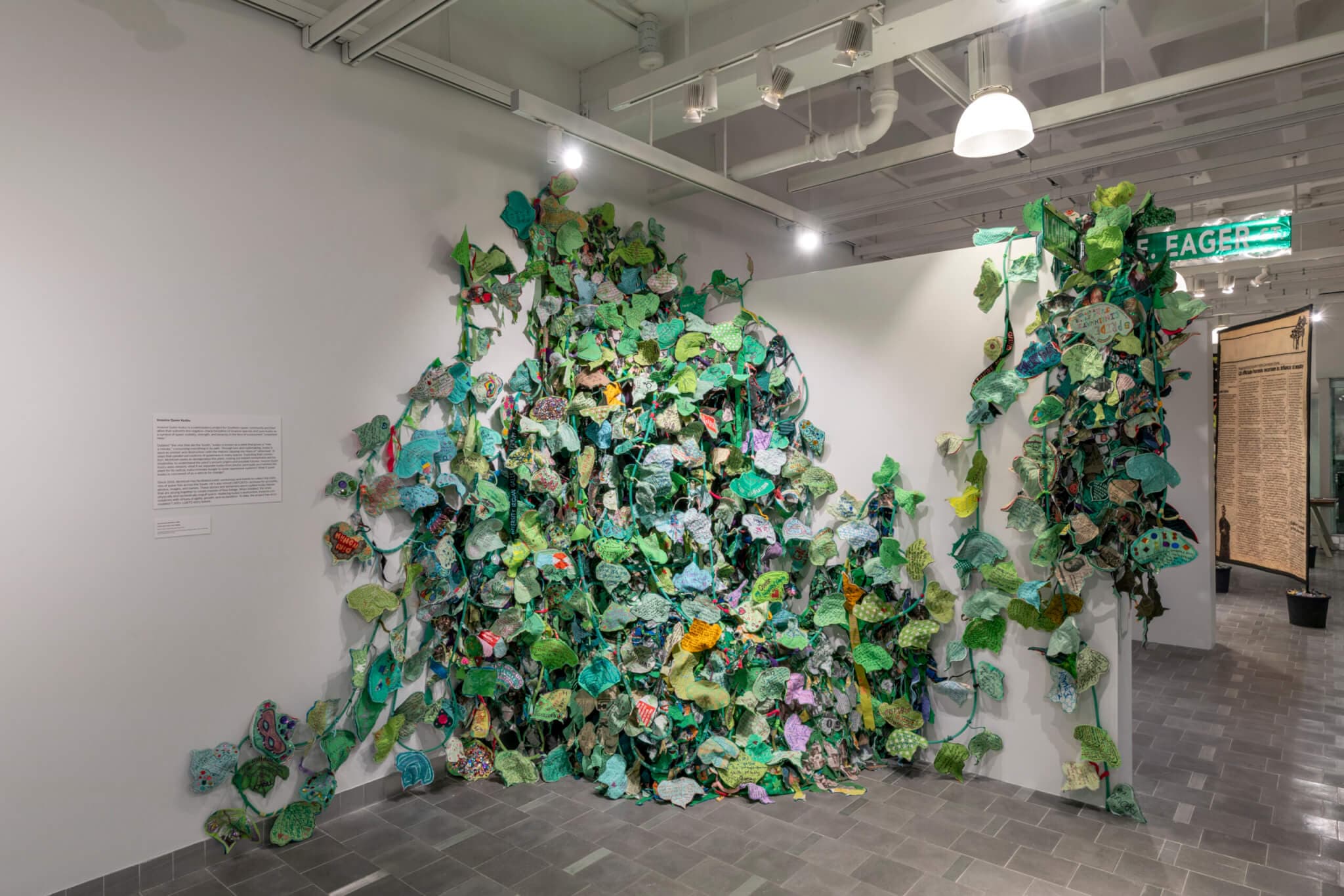 KD: You’re referencing something I was curious about regarding the two Monument Invasion works in the exhibition. One is titled First Southern Baptist Church, and the other is MountainTop Removal, and both are from 2018. Are the archival leaves of the kudzu created in the same space by individuals from local communities in proximity to these titles, or are they from a national reach of different participants then brought into conversation with the specific place?