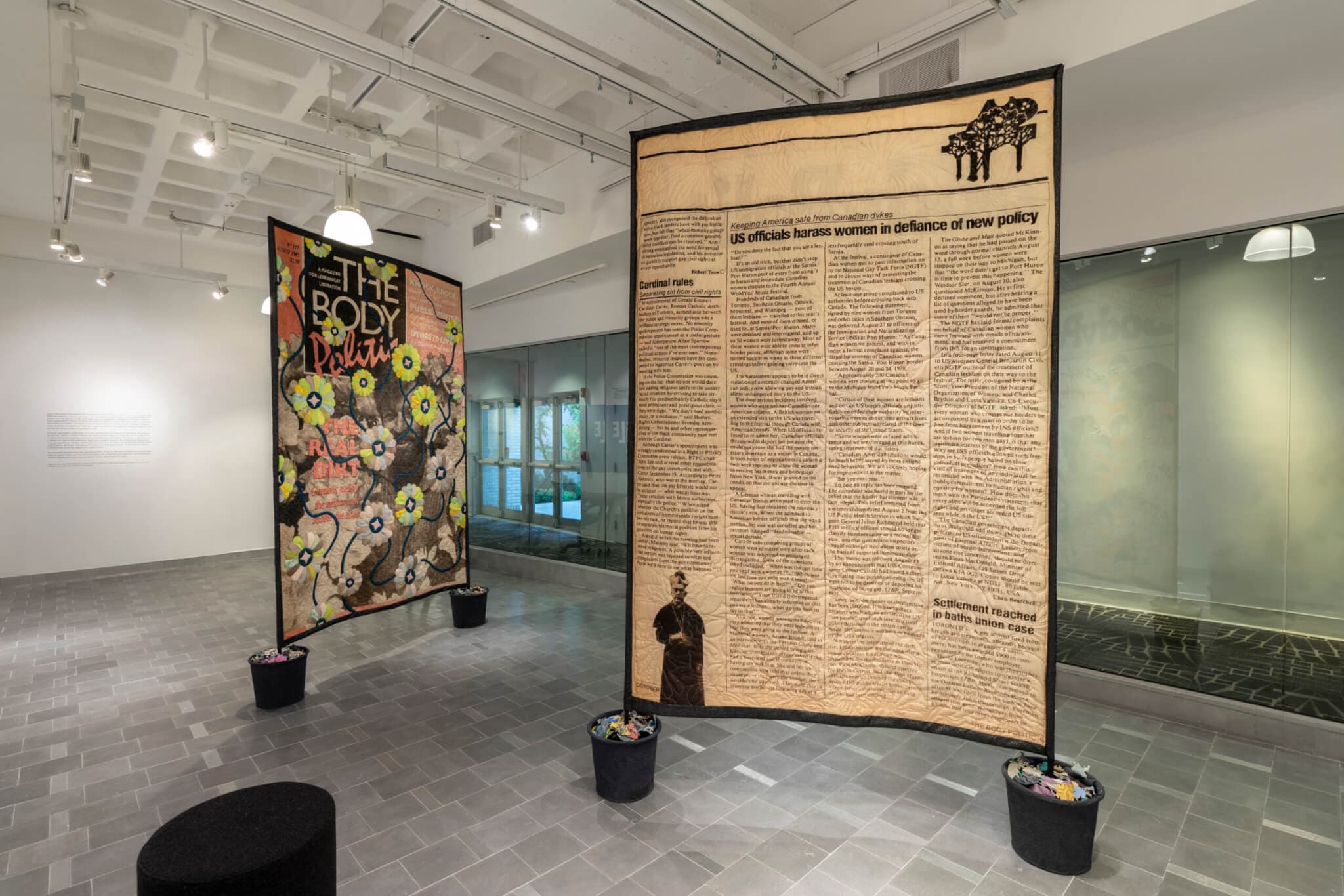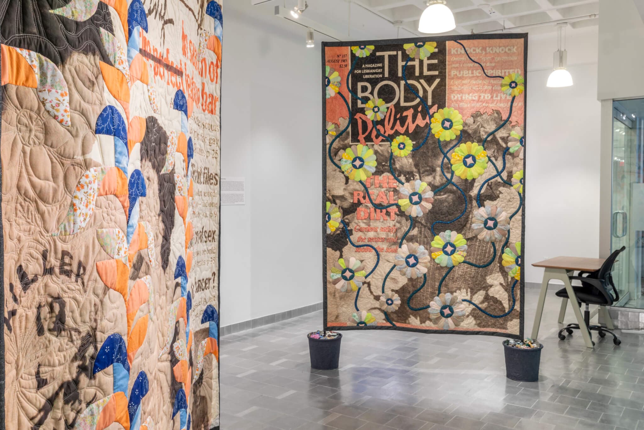Your archival interests also appear in your large-scale quilt sculptures Entanglements: Dying to Live / The Real Dirt and Entanglements: Flowers at the Border / Keeping Safe, which display covers from a Canadian queer activist magazine, Body Politic. These works are collaborative in the sense that you’re working with materials put together by other people across space and time. And magazine covers have shown up in your quilts for years. Could you share a little about this?