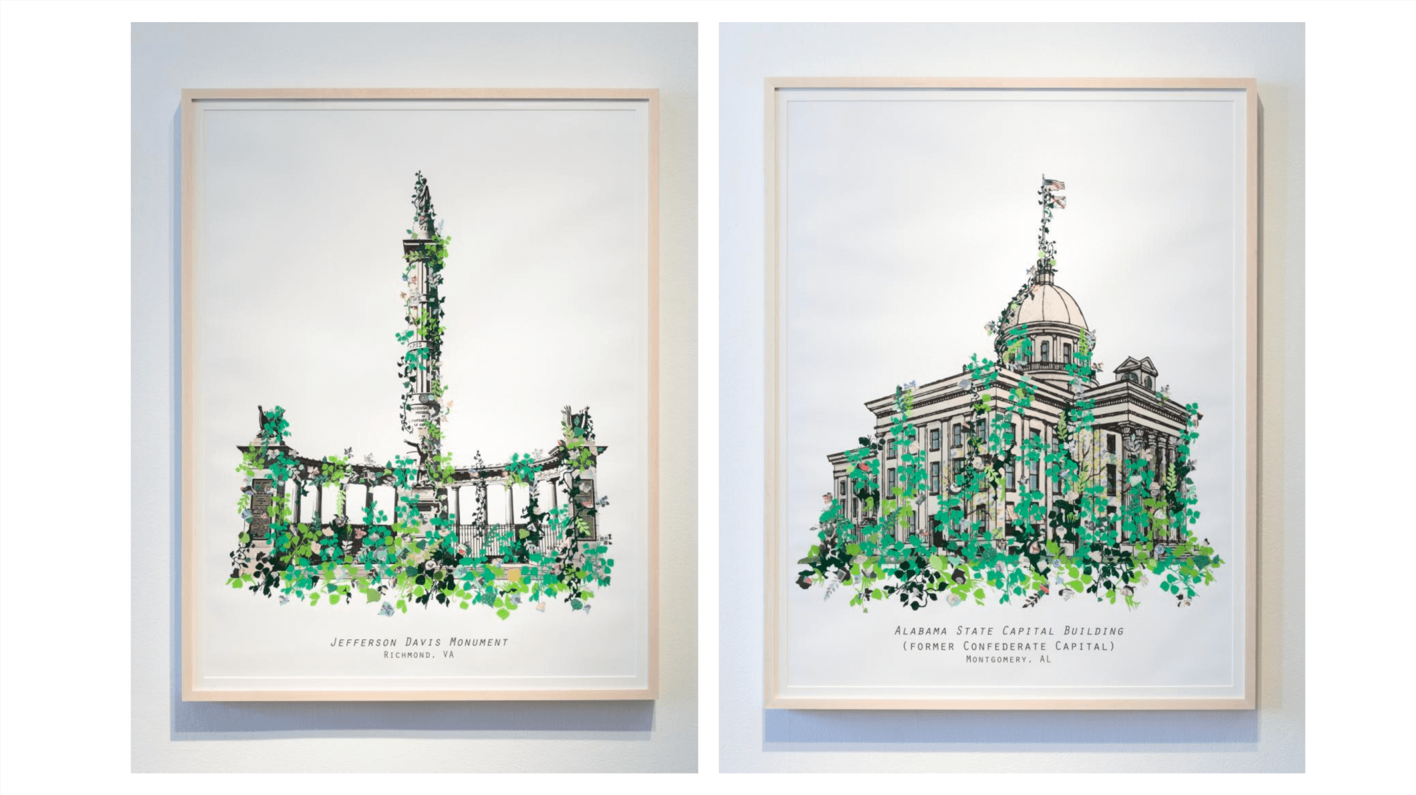 (left) Aaron McIntosh, Monument Invasion: Jefferson Davis Monument, 2018. Collage on archival inkjet print. (right) Aaron McIntosh. Monument Invasion: Alabama State Capital Building (Former Confederate Capital), 2018. Collage on archival inkjet print. Courtesy of the artist. Photo by Aaron McIntosh.